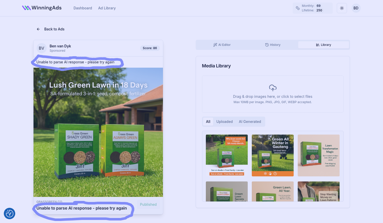 When publishing the ad, the software had some compliance suggestions. I asked that it implements the suggestions, and then it came back with the “Unable to parse AI response”